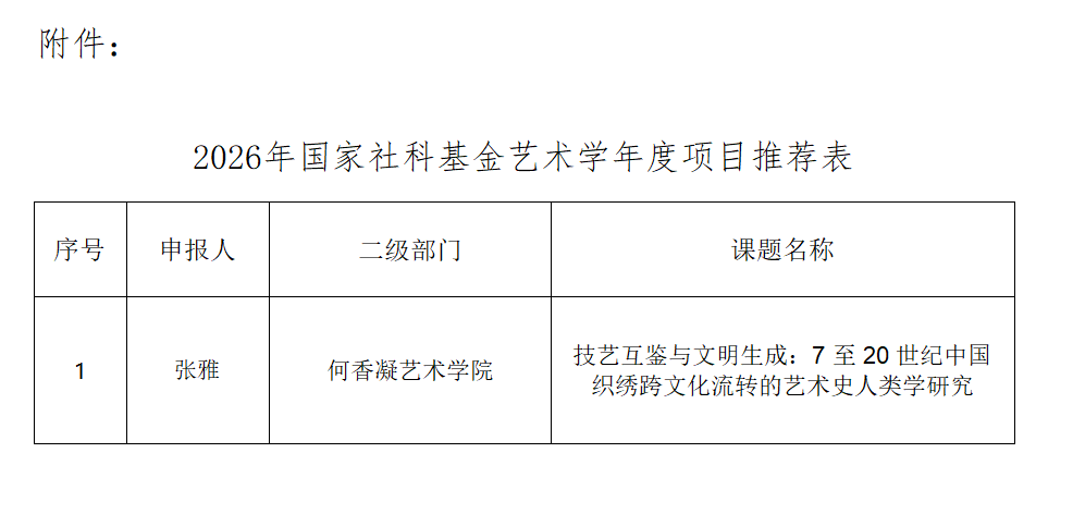 根据《2026年国家社科基金艺术学年度项目申报公告》及省级主管部门要求,我校组织专家评审,现将项目评审结果予以公示(详见附件)。