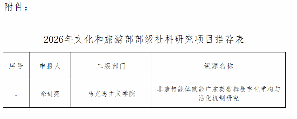 根据《文化和旅游部办公厅关于推荐2026年文化和旅游部部级社科研究项目的通知》及省级主管部门要求,我校组织专家评审,现将项目评审结果予以公示(详见附件)。