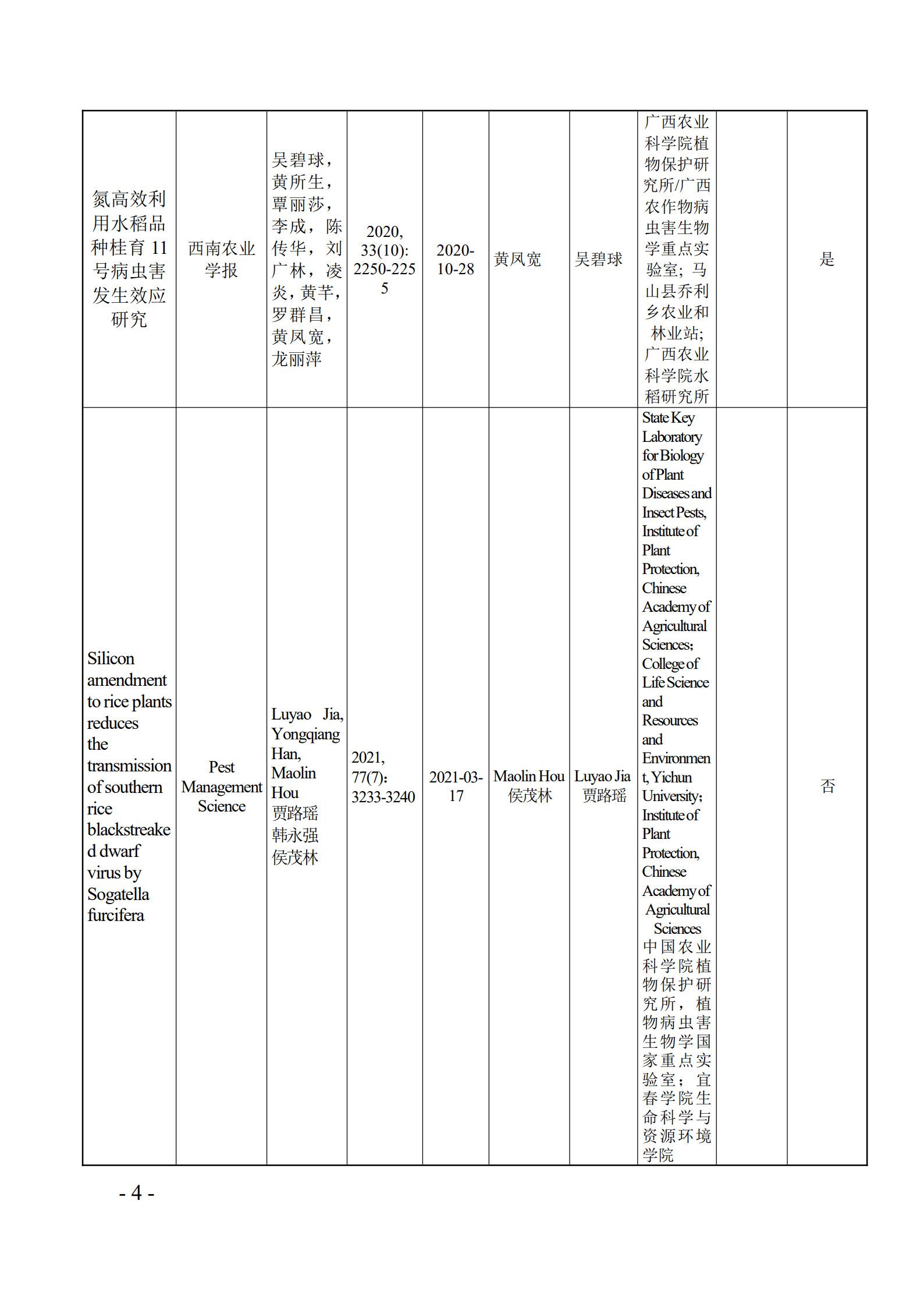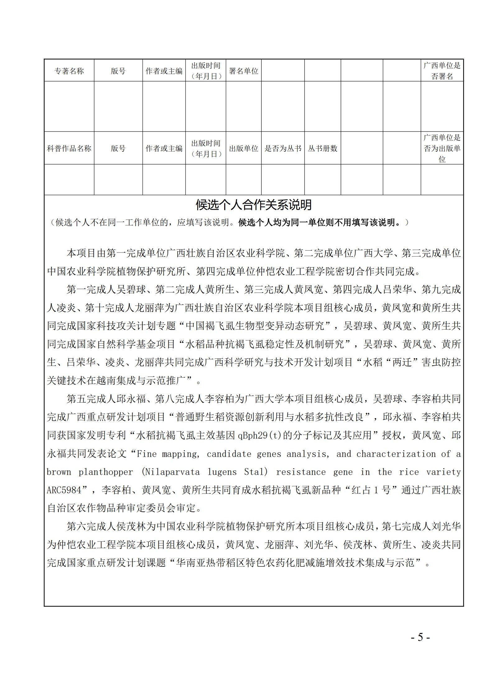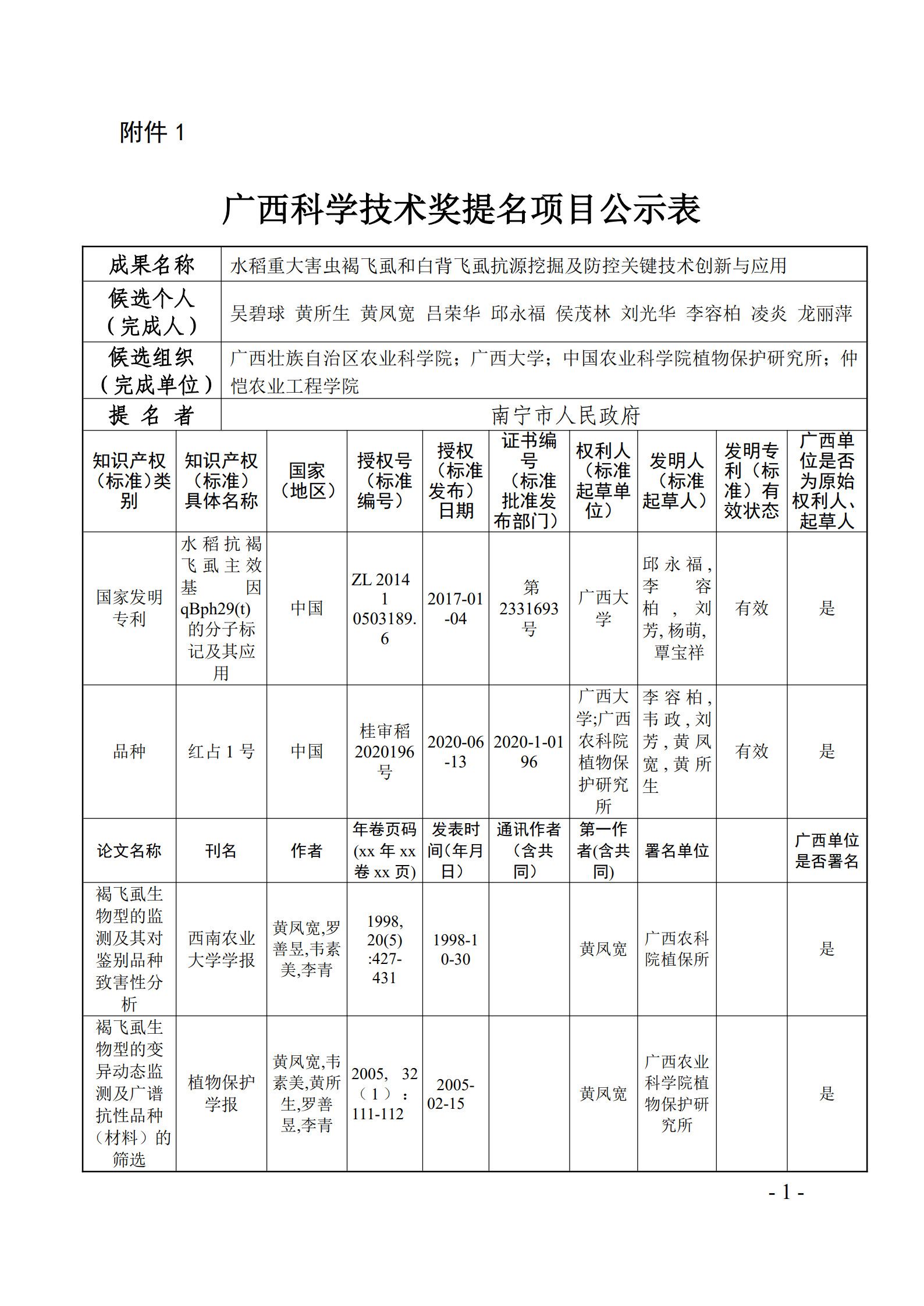 根据《广西科学技术奖励办法》(桂政发〔2025〕4 号)及其实施细则(桂科规字〔2025〕8 号)和《广西科学技术奖提名工作手册(2025年)》等文件的要求,提名2025年度广西科学技术奖需要在候选个人单位进行公示,由我单位参与的成果“水稻重大害虫褐飞虱和白背飞虱抗源挖掘及防控关键技术创新与应用”拟提名2025年度广西科学技术进步奖一、二等,其中刘光华研究员为第七完成人。现就有关内容进行公示,公示时间:2025年8月23日至2025年8月30日,共7日。