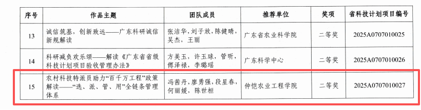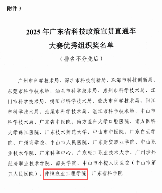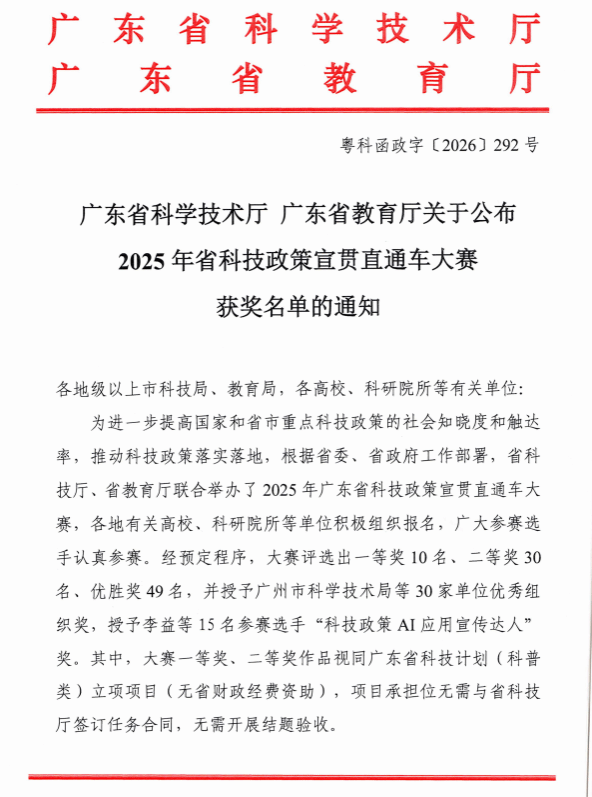 近日,广东省科学技术厅、广东省教育厅联合发布了《关于公布2025年省科技政策宣贯直通车大赛获奖名单的通知》(粤科函政字〔2026〕292号),我校在大赛中表现优异,共有7名教师报名参赛,最终斩获二等奖1项、优胜奖1项,并获得优秀组织奖。