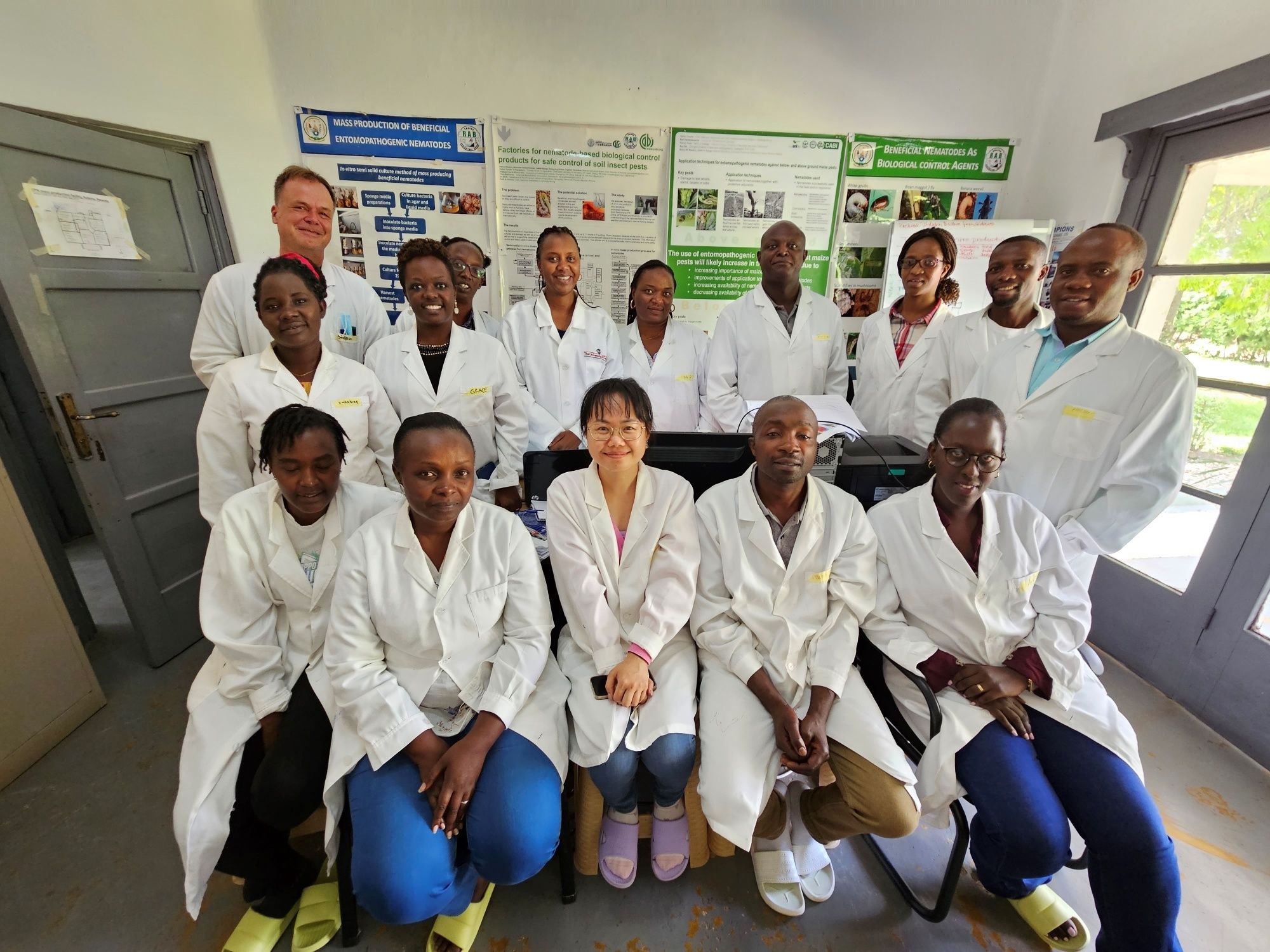 颜珣与CABI瑞士中心的Stefan Toepfer博士一起,在RAB南方区生物制剂生产基地对来自RAB、卢旺达大学(University of Rwanda-CAVM)、生物防治公司AgroyPy和科技学院IPRC-Huye的科学家、技术人员和研究生提供昆虫病原线虫大量培养及应用技术的培训,同时指导开展昆虫病原线虫及共生细菌培养基优化、昆虫病原线虫防控食用菌害虫生物测定等实验,并对前期实验收集的数据进行分析,撰写应用昆虫病原线虫防控草地贪夜蛾和番茄潜叶蝇的研究论文,为项目结题做准备。颜珣出访卢旺达期间,恰逢中国工程院院士、广东省科学院微生物研究所吴清平院士带领团队在卢旺达采集样品,颜珣邀请吴院士团队参观了我们参与建设的RAB南方区生物制剂生产基地,吴院士鼓励RAB团队继续开展应用昆虫病原线虫防治食用菌害虫的研究并进行应用推广。