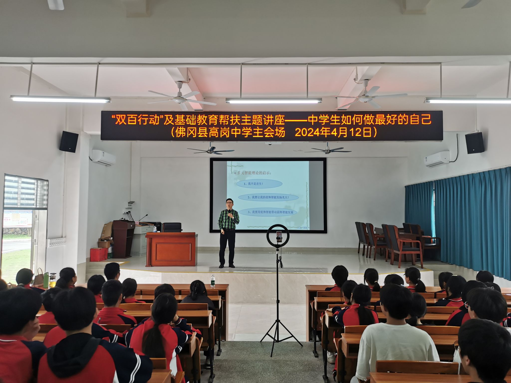 为进一步推动“双百行动”及基础教育帮扶落地见效,结合丰顺县、佛冈县关于“中学生心理动员”的培训需求,我校教师发展中心于4月12日前往高岗中学开展帮扶工作。本次帮扶邀请广州大学教育学院副教授曾小军面向高岗中学200余名初三年级学生开展“‘双百行动’及基础教育帮扶主题讲座”,丰顺县第一中学、球山中学、龙山中学、汤坑中学、汤西中学、潭江中学、砂田学校7所学校共约2650名初二年级学生同步观看线上直播。