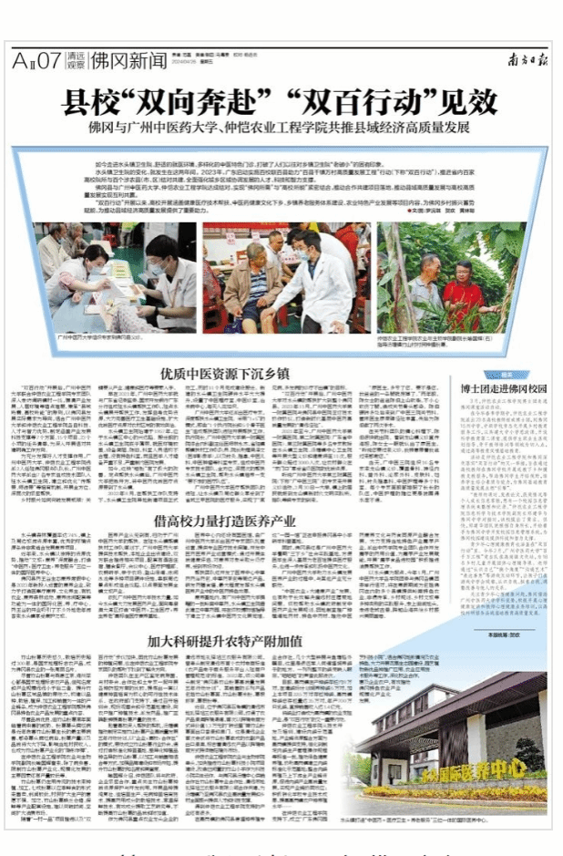 “双百行动”开展后,广州中医药大学对水头镇的帮扶扩大到整个佛冈县。2023年11月,广州中医药大学第一附属医院与佛冈县中医院签订技术协作协议,打造新时代基层中医药高质量发展的“清远经验”。