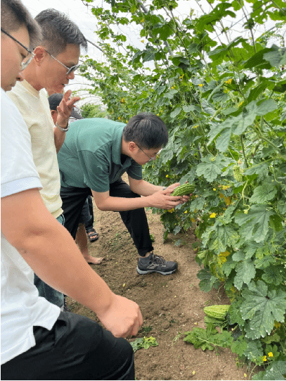 座谈会后,农村科技特派员团队在镇政府工作人员陪同下深入农田一线,实地查看水稻和苦瓜种植情况。在水稻种植区与农户面对面交流,详细了解种植规模、种子来源、田间管理等关键环节。针对当前农户普遍关心的病虫害问题,左继浩重点讲解了稻瘟病、稻飞虱、二化螟等常见病虫的识别要点与绿色防控策略,建议采取“农业防治+生物防治+科学用药”的综合管理模式,合理安排施肥与轮作,配合高效低毒药剂精准防治,减少农药使用量,保障生态安全和水稻品质。在苦瓜基地,团队重点关注苦瓜苗生长状况,深入分析新品种的适应性、产量潜力与市场前景,强调要以科学管理为抓手,不断提升苦瓜产业的综合竞争力。