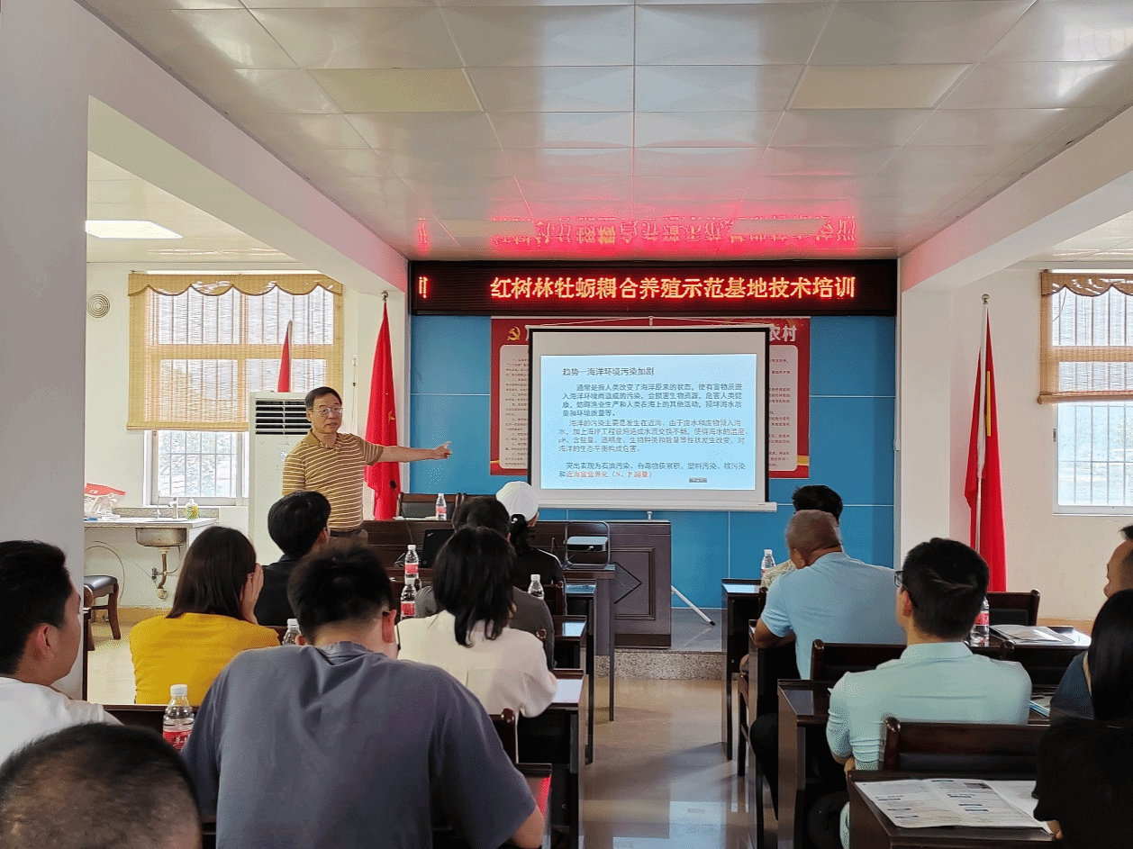 华南农业大学杨慧荣教授团队联合深井镇、北陡镇、汶村镇科技特派员团队为生蚝养殖户开展了“红树林牡蛎耦合养殖示范基地技术培训”。在深井镇小江村党群服务中心,主讲专家余祥勇教授详细介绍了红树林牡蛎耦合养殖的技术原理和操作要点,指出在养殖过程中要严格遵守环保法规,保护好红树林生态环境,实现渔业发展与生态保护的良性互动;同时还需加强品牌建设,提高红树林牡蛎的市场知名度和附加值。会后专家团队与当地养殖户进行了互动交流,解答了他们在生蚝养殖过程中遇到的疑难问题。专家团队现场为养殖户派发了华南农业大学编写的《台山市生蚝养殖技术手册》、中国水产科学研究院南海水产研究所编写的《华南沿海海水养殖动物常见病害防控手册》等学习资料。通过此次培训,当地养殖户对红树林牡蛎的养殖技术有了更全面的了解和认识。