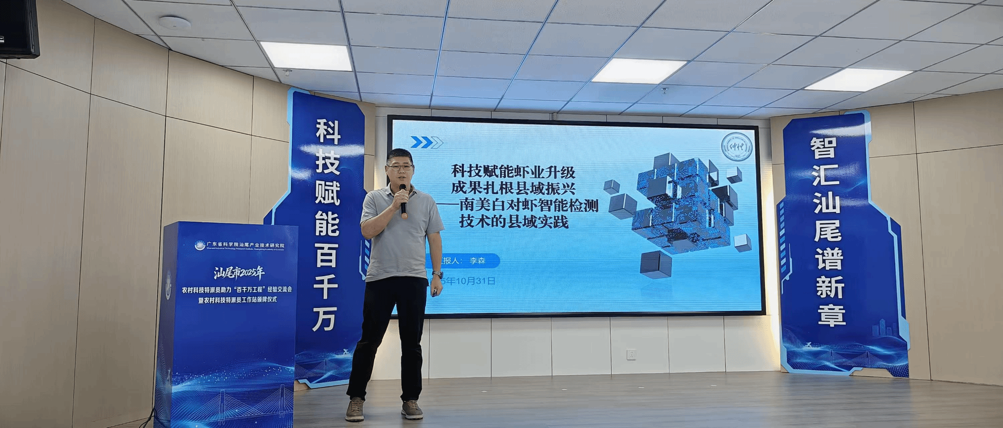 我校李森老师作为2025年广东省科技成果“入县达镇”项目负责人,汇报展示了“南美白对虾智能表型检测与生长监控技术”的县域实践成果。他围绕传统养殖中“投喂凭经验、健康难量化、监测效率低”等痛点,系统介绍了团队研发的AI图像识别与运动轨迹追踪技术,实现对虾体长、摄食量与健康状态的精准监测。该技术通过构建决策支持系统,推动养殖过程从“靠经验”向“看数据”转型,为县域水产养殖智能化升级提供了坚实科技支撑。