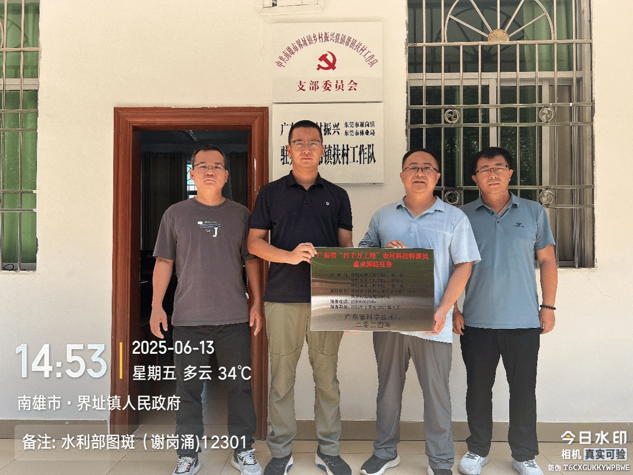 6月14日,农业与生物学院农村科技特派员蒋锋带队,邀请我校农学专家刘鹏飞教授,前往韶关市南雄市界址镇,与界址镇驻镇帮扶工作队共同举行了 “广东省‘百千万工程’农村科技特派员重点派驻任务”挂牌仪式。此次活动标志着省级科技力量正式落地界址镇,为当地农业高质量发展提供稳定长效的技术支持。