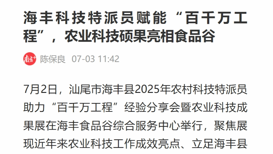 会上,林博府表示,汕尾市自深入实施科技特派员制度以来,已经探索出了一条具有汕尾特色的科技助农新路径。海丰县以食品谷为核心载体,充分整合12个镇特色产业资源,通过科技特派员“以点带面”的帮扶模式,实现了镇域产业联动、全域协同发展,为乡村振兴注入了强劲动能。接下来,市、县两级将继续深化“三个一”服务模式,做精做细全链条服务,持续推动科技成果转化,构建全领域覆盖的新生态,不断强化人才培育,激发乡村振兴的新活力,逐步推动科技特派员制度在汕尾海丰大地落地生根、开花结果,为乡村振兴贡献科技力量。