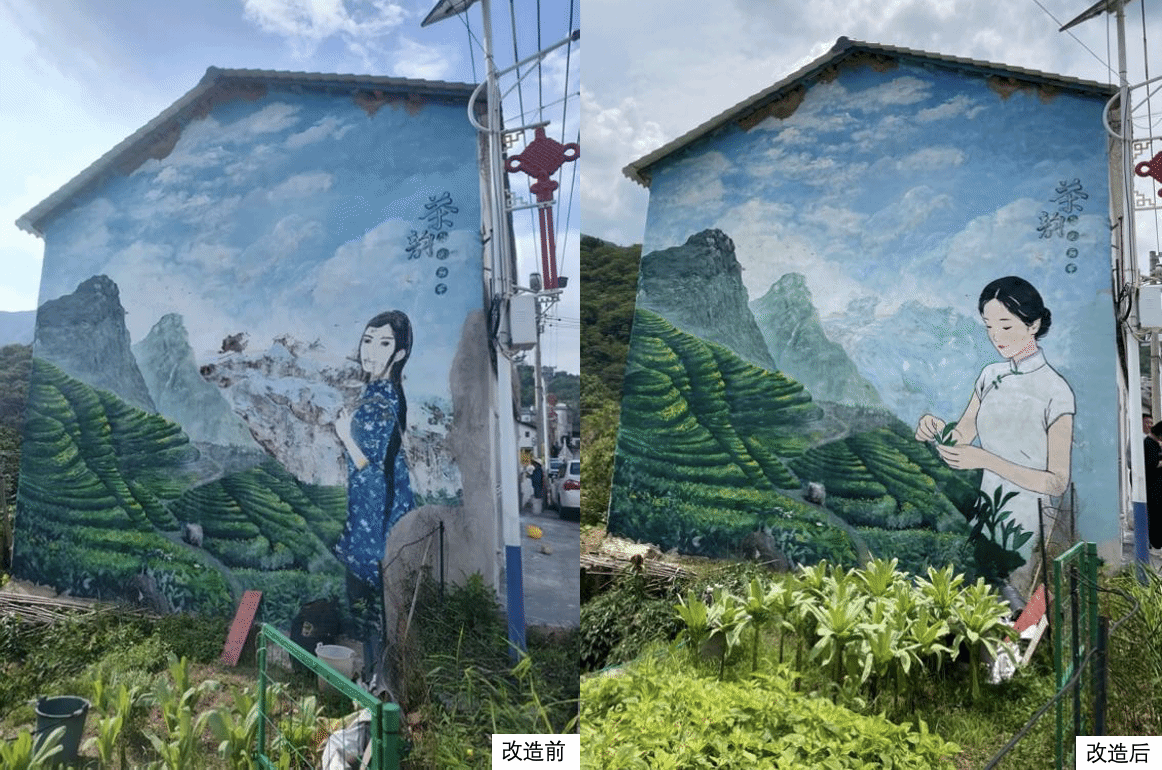 团队结合良田乡本土自然特色与农耕文化,精心绘制了三幅大型主题墙绘,并对原有“采茶姑娘”墙绘进行了修复提升。通过主题墙绘望展现良田乡历史底蕴与乡村美好生活愿景,形成传播文明、展现乡风、提升村容村貌的亮丽风景线。