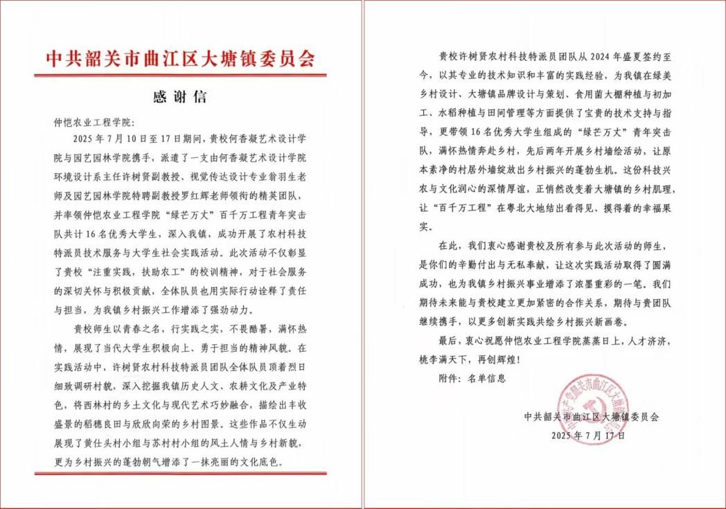 本次下乡实践成效显著,获得大塘镇人民政府及村民高度认可。活动充分彰显了科技与艺术融合在乡村振兴中的强大驱动力,在村民心中深植科技兴农、文化润心的种子,为大塘镇深入实施乡村振兴战略提供了“仲恺样板”。大塘镇政府特致信感谢,热切期盼未来深化校地共建,汇聚更大合力,持续为“百千万工程”高质量发展注入澎湃动能。