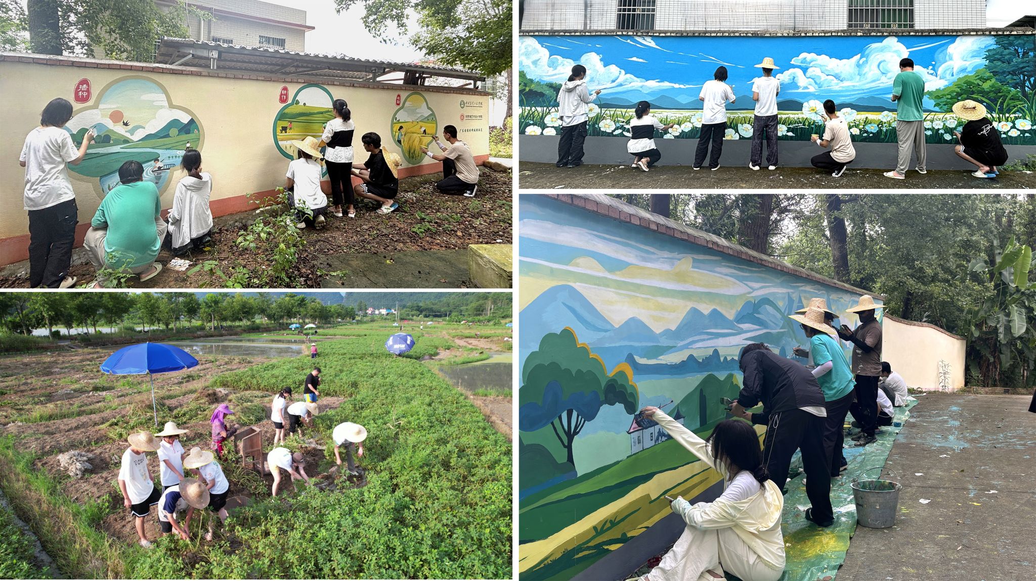 在三下乡实践活动中,我校师生以青春之名,行实践之实,不畏酷暑,满怀热情,展现了当代大学生积极向上、勇于担当的精神风貌。仲恺“绿芒万丈”突击队深入挖掘大塘历史人文、农耕文化及产业特色,将西林村的乡土风情巧妙融入现代艺术中。他们挥汗如雨,历时8天,在黄仕头及苏村村小组创作完成6幅主题鲜明的大型墙绘,总面积达265平方米。画面生动展现了稻穗飘香的丰收盛景与欣欣向荣的乡村新貌,为古朴村落注入蓬勃的文化活力,成为“百千万工程”最亮眼的视觉注脚。同时,实践团队还扎根大塘镇田间地头,挥汗助力花生抢收,在躬身实践中体悟农情,于最朴实的劳作中锤炼品格,以青春担当践行助农使命。