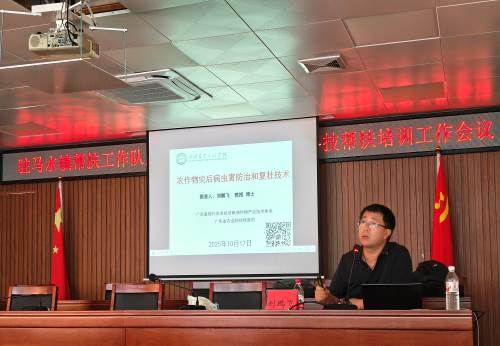 受台风“桦加沙”与“麦德姆”连续影响,阳江市阳春马水镇部分农田和果树出现倒伏及病虫害多发情况,农业生产面临严峻挑战。为助力灾后复产,提升农户灾后水稻和果树等的栽培管理和病虫害防控,农业与生物学院农村科技特派员宋汉达团队迅速响应,特邀农业与生物学院刘鹏飞教授与园艺与园林学院涂攀峰副教授,于10月17日赴马水镇开展专项技术培训与田间实地指导,聚焦水稻与番石榴两大主导产业,为农户送去关键技术支撑。
