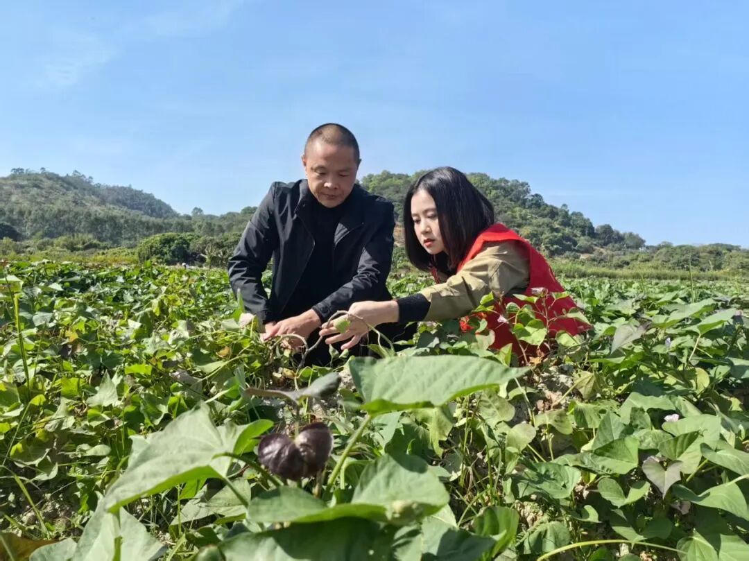 近些年来,广东省饶平县组织科技人才深入田间地头,为农户提供技术指导和生产服务,赋能农业产业提质增效。图为近日,在黄冈镇里和睦村,仲恺农业工程学院科技特派员(右)实地察看“揭阳红”番薯长势情况。
