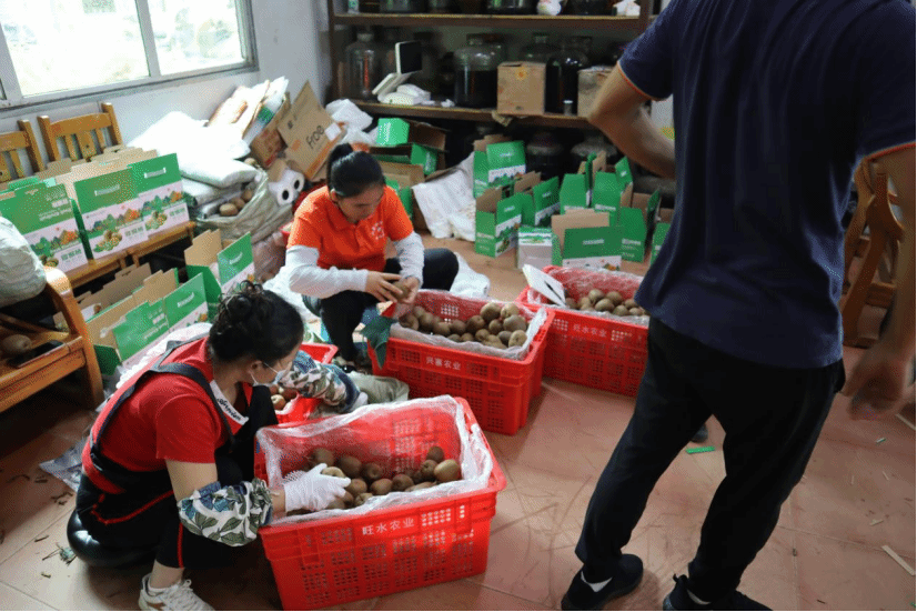 随后,团队成员前往广州市旺水农业有限责任公司的猕猴桃生产基地(吕田镇吕新村),就猕猴桃生产技术进行了现场交流。旺水公司负责人介绍,目前公司栽培品种单一,主要是“武植3号”和“仲和红阳”,商品果的比例较低、受到虫鸟的危害严重;果园没有配置授粉树,产量完全依赖人工授粉,今年的气候对产量影响较大。团队针对性给出猕猴桃发展规划建议,详细介绍了“仲和黄玉”新品种的示范情况,通过引进该品种,可以实现果园“红黄绿”三色搭配,满足珠三角市场对彩色猕猴桃的需求。并且,团队建议按照8:1搭配授粉树,结合天然授粉和人工授粉,保证果园产量和品质。