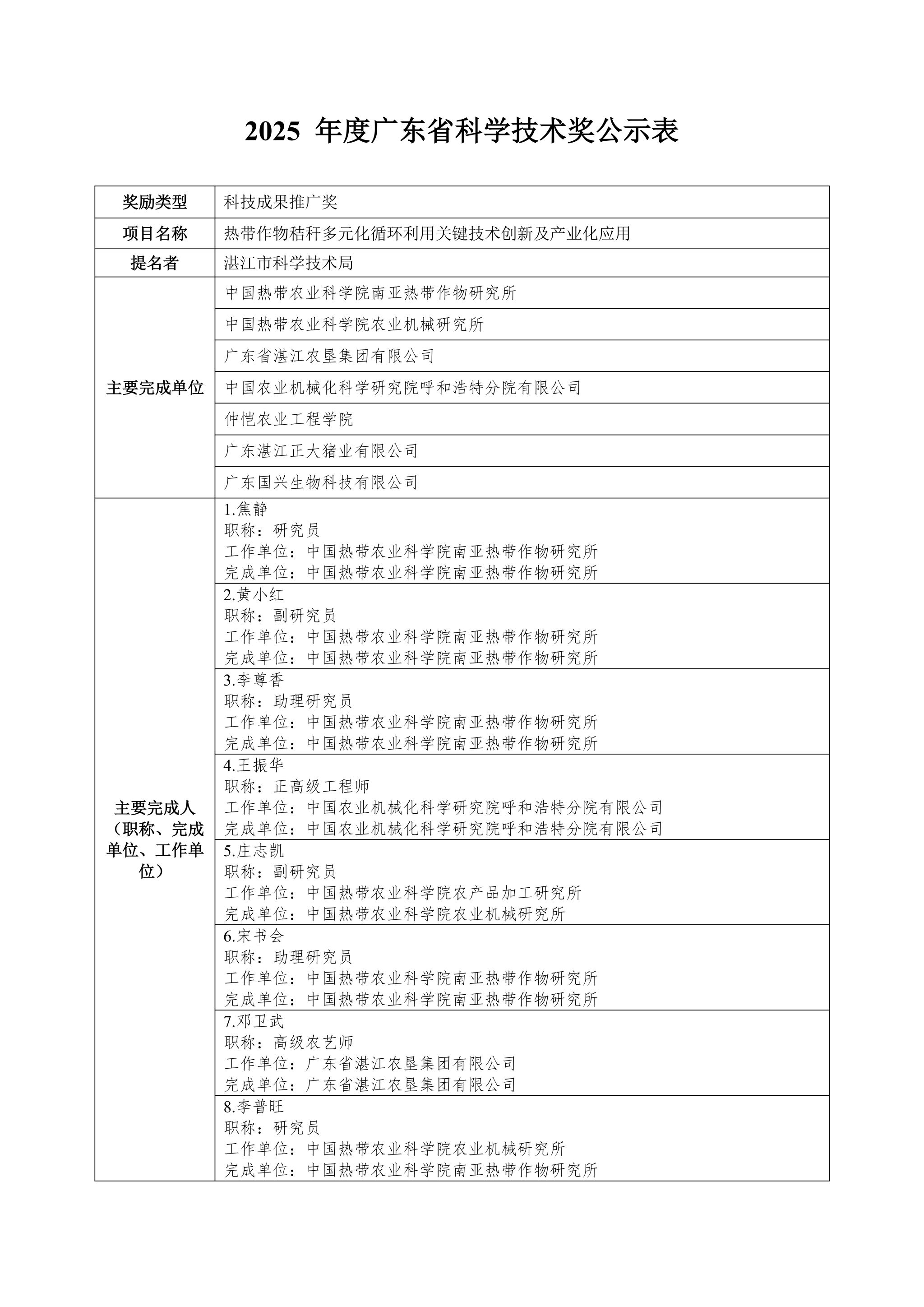 根据《广东省科学技术厅关于2025年度广东省科学技术奖提名工作的通知》(粤科函区字〔2025〕1942 号)的要求 ,现将我单位资源与环境学院潘晓莹参与申报2025年度广东省科学技术奖的提名项目“热带作物秸秆多元化循环利用关键技术创新及产业化应用”的有关内容予以公示,提名类别:科技成果推广奖。