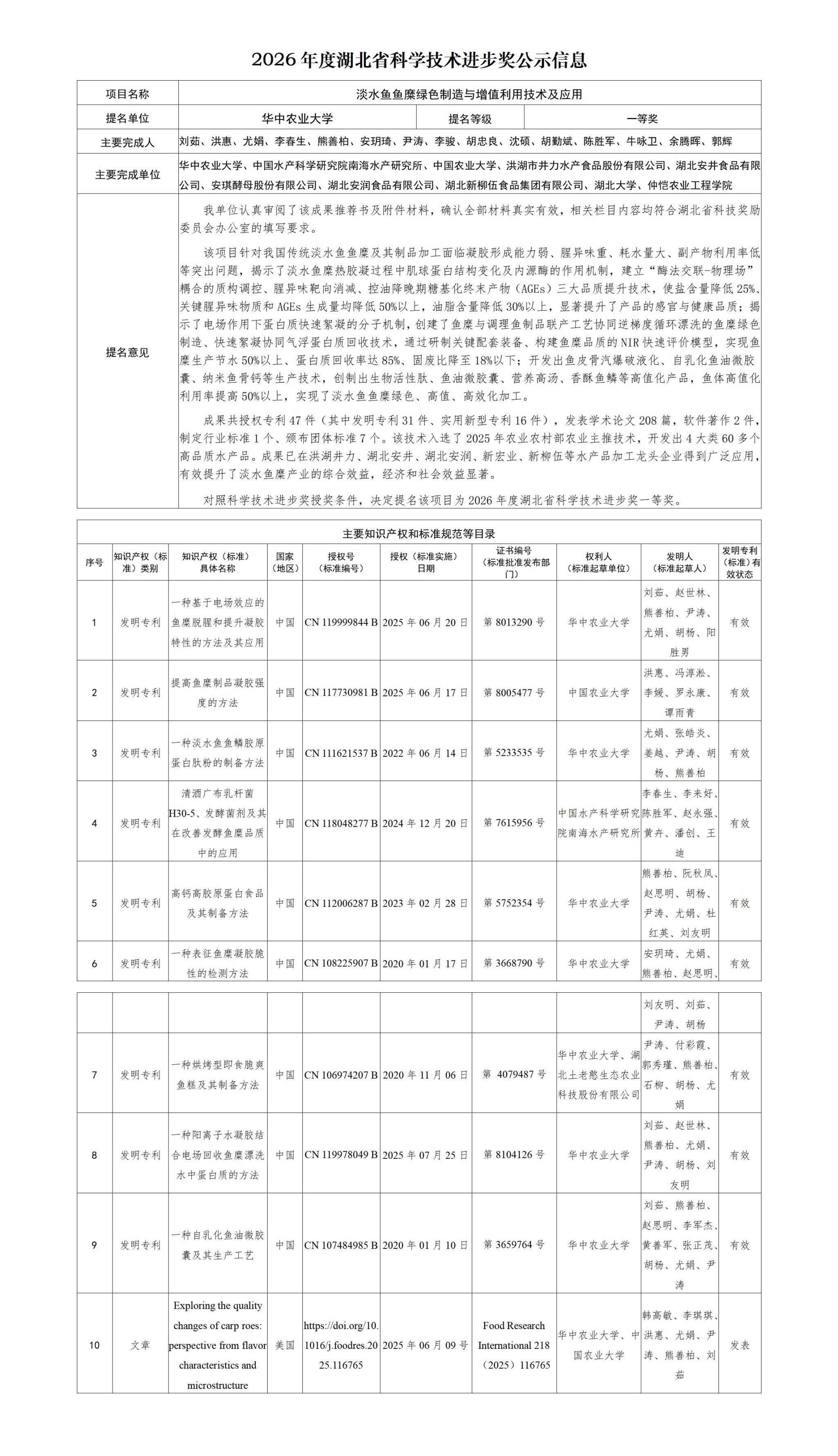 根据2026年度湖北省科学技术进步奖申报通知的要求 ,现将我单位轻工食品学院李骏参与申报的提名项目“淡水鱼鱼糜绿色制造与增值利用技术及应用”的有关内容予以公示,提名类别:湖北省科学技术进步奖一等奖。